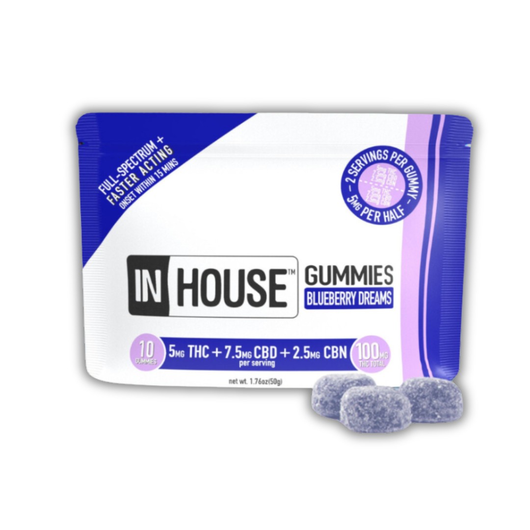Description: Wind down naturally with InHouse Blueberry Sleep Gummies, expertly dosed with THC, CBD, and CBN to promote deep, restful sleep. These vegan, gluten-free gummies are made with real fruit juice, naturally flavored and colored, and completely free of preservatives and high-fructose corn syrup. Each fast-acting gummy kicks in within 15 minutes to help calm the mind and body—perfect for bedtime routines or stress-filled evenings.